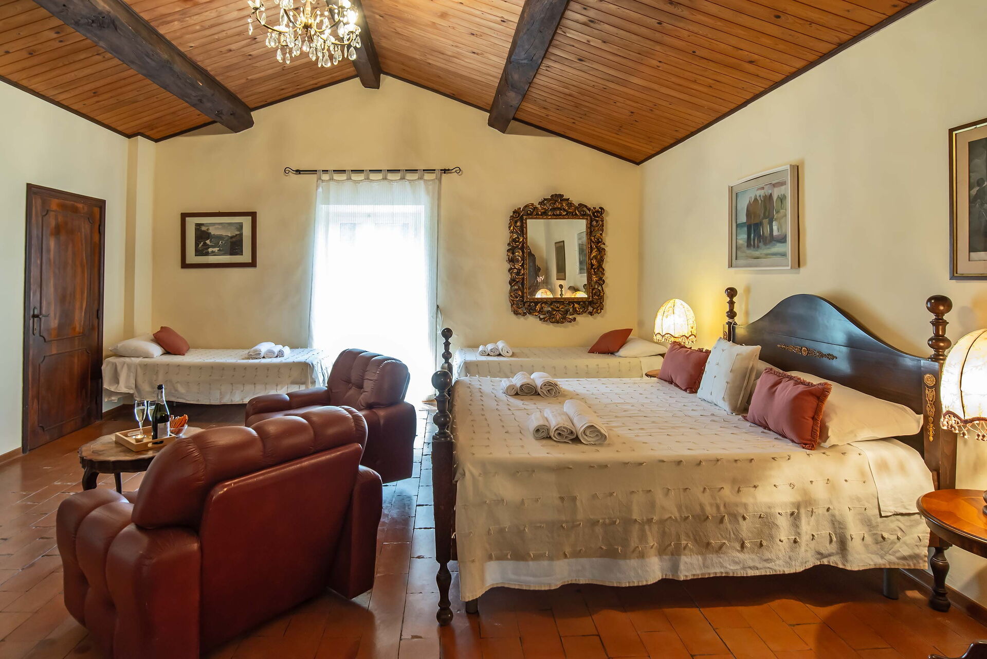 Bedroom + Ensuite Bathroom 4 (22 m2): double bed, two single beds, baby crib, WIFI internet, air conditioning, mosquito net, television, two armchairs, working desk, basin, toilet, bidet, bathtub, hairdryer, exit to the terrace.