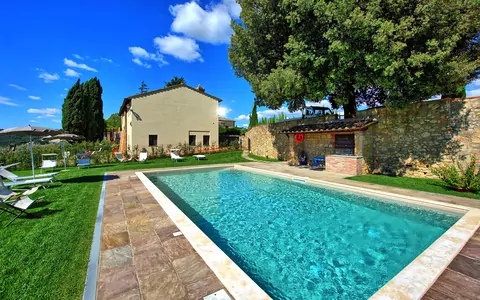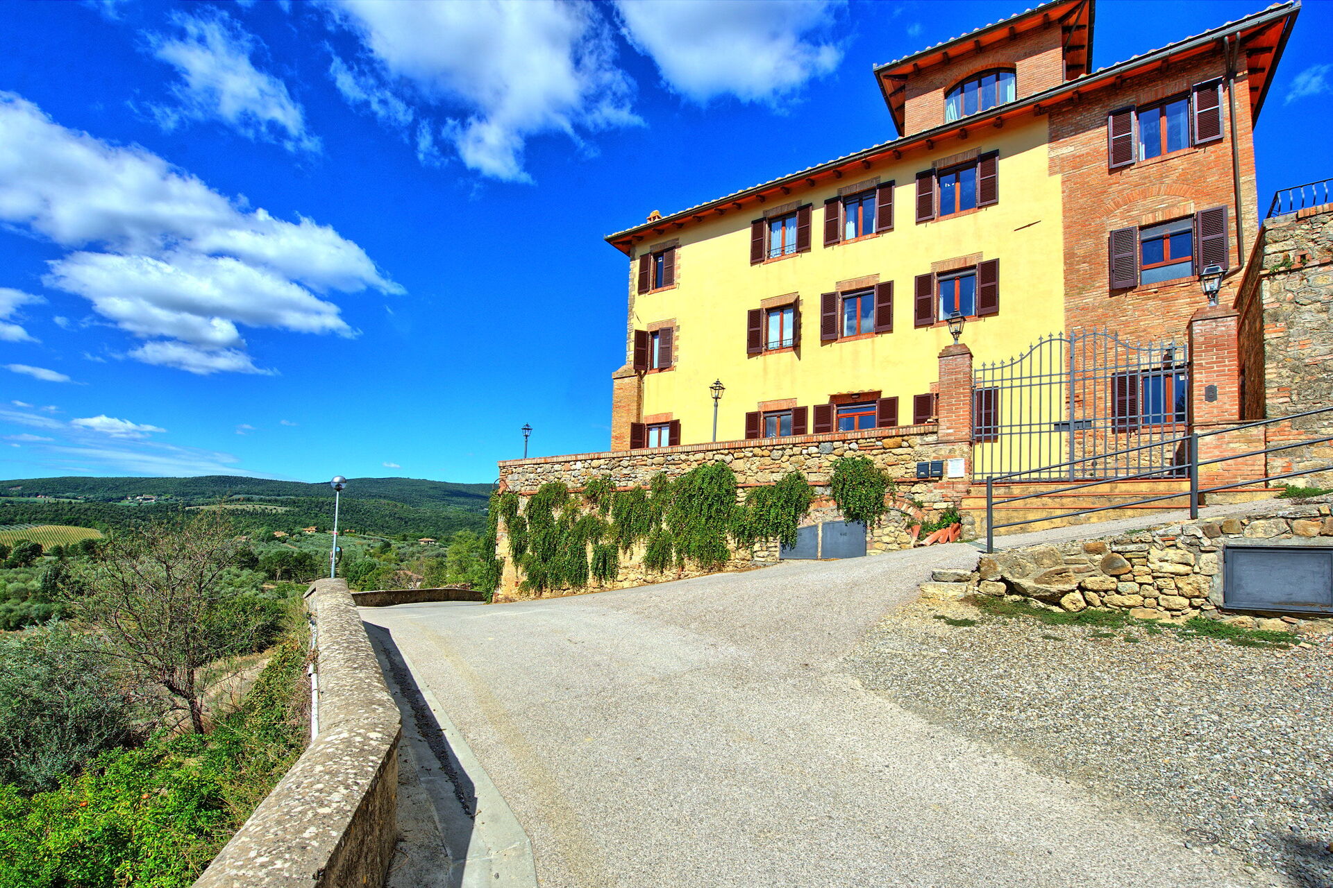 Large property on the top of a hill just a few kilometers from San Gimignano, nestled among vineyards and olive groves.