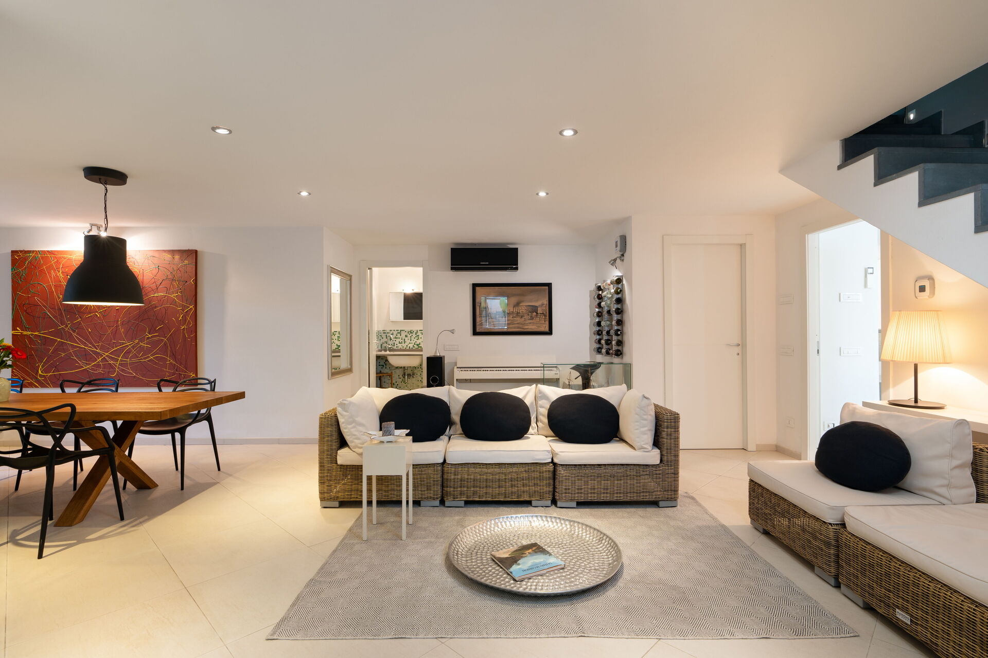 Kitchen + living room: well equipped kitchen, dining table, dishwasher, fridge, freezer, microwave, stove top, oven, italian coffee machine, sofa, WIFI internet, air conditioning, satellite tv.