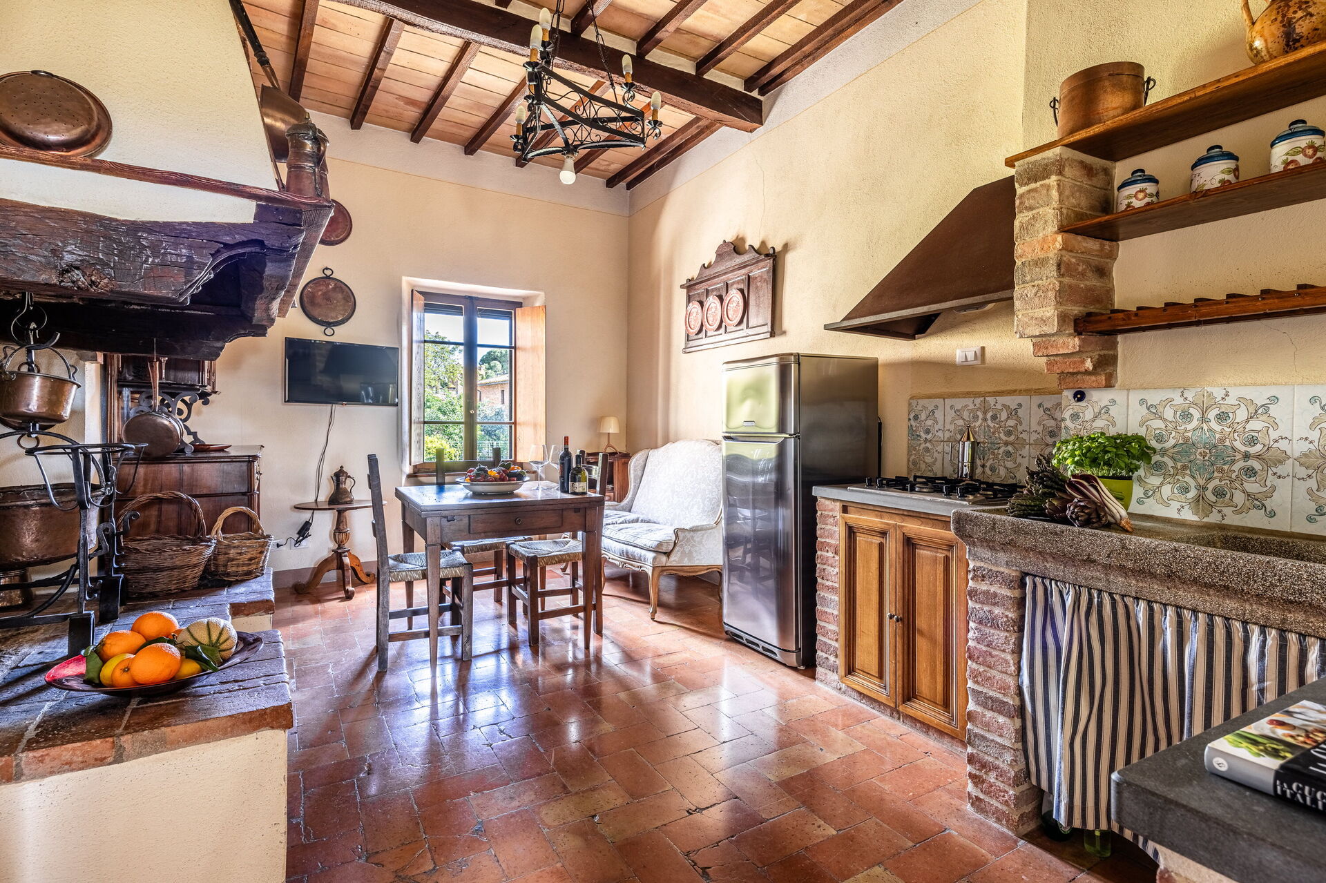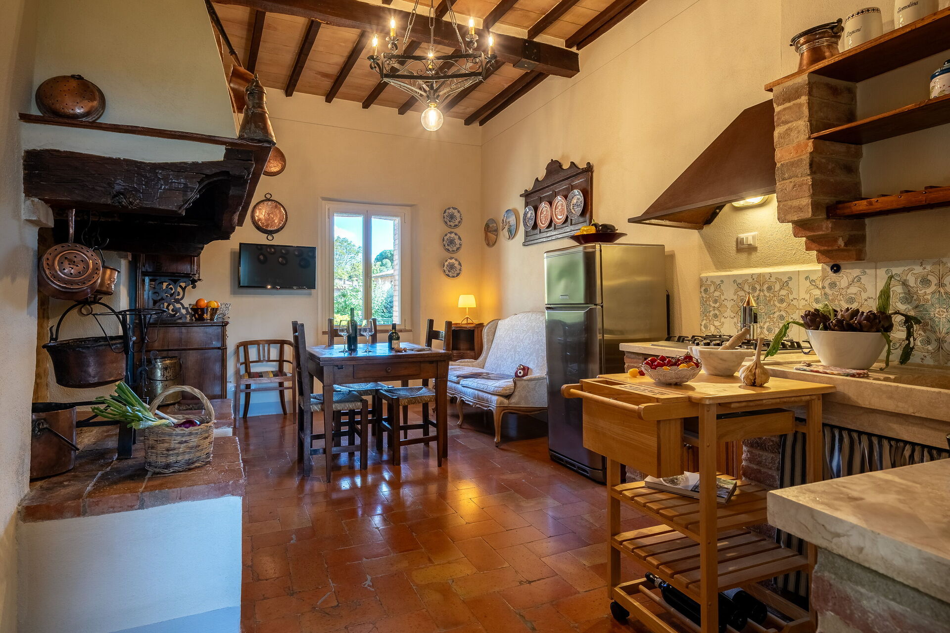 Kitchen + living room: well equipped kitchen, dining table, fridge, freezer, stove top, sofa, fireplace, WIFI internet, television.