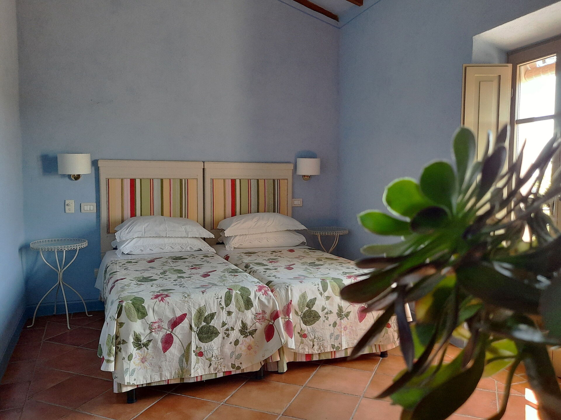 Bedroom + Ensuite Bathroom 3: two single beds (length: 1.9m, width: 0.8m), air conditioning, ceiling fan, two armchairs, basin, toilet, bidet, shower, hairdryer.