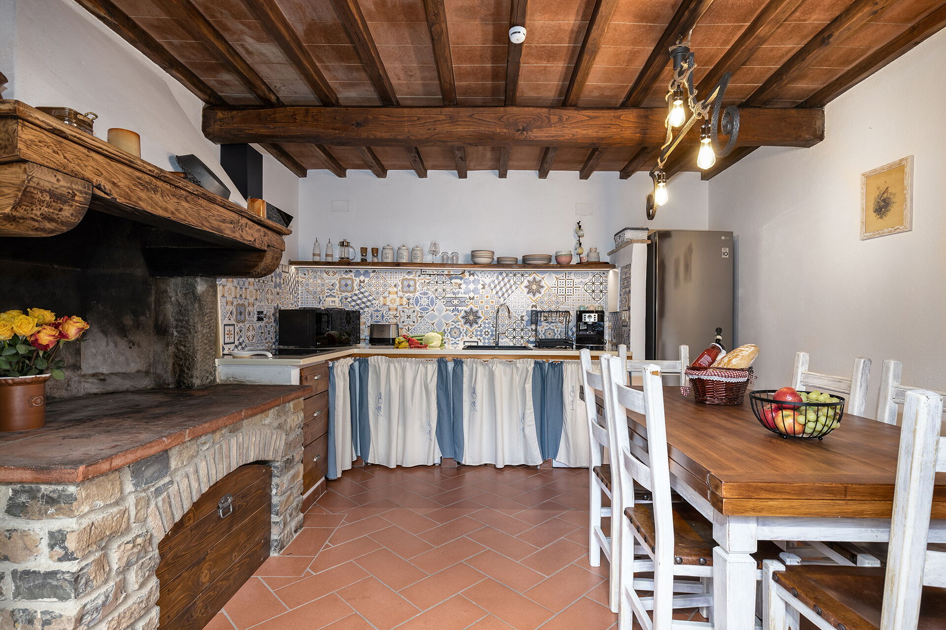 Kitchen (18 m2): well equipped kitchen, dining table, dishwasher, fridge, freezer, microwave, stove top, toaster, iron, italian coffee machine, washing machine, fireplace, WIFI internet, highchair, smoke detector, co2 detector, exit to the patio.