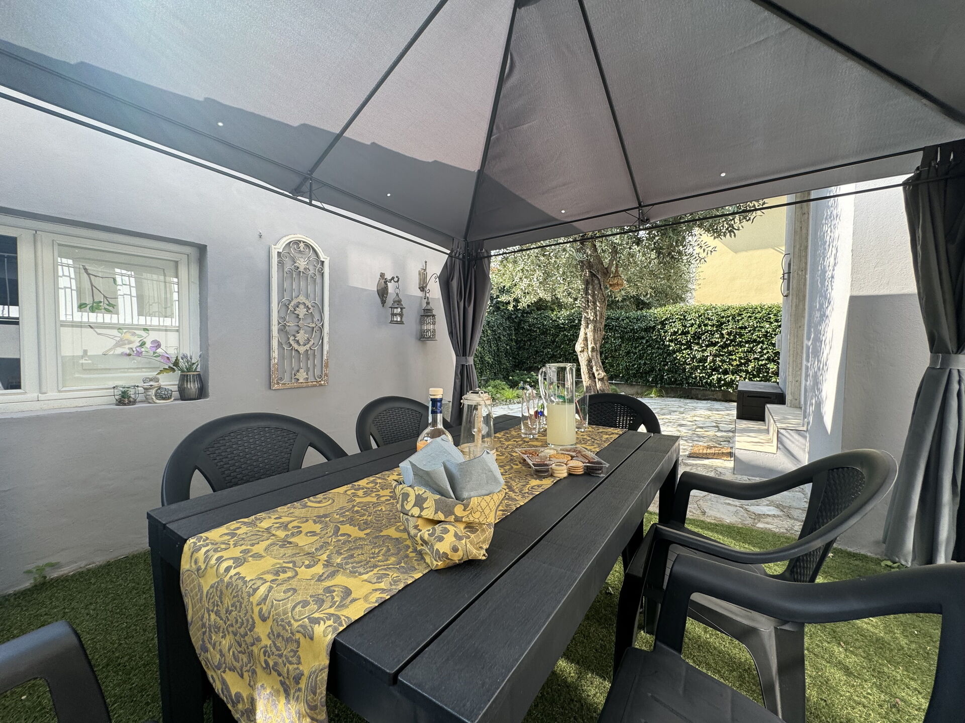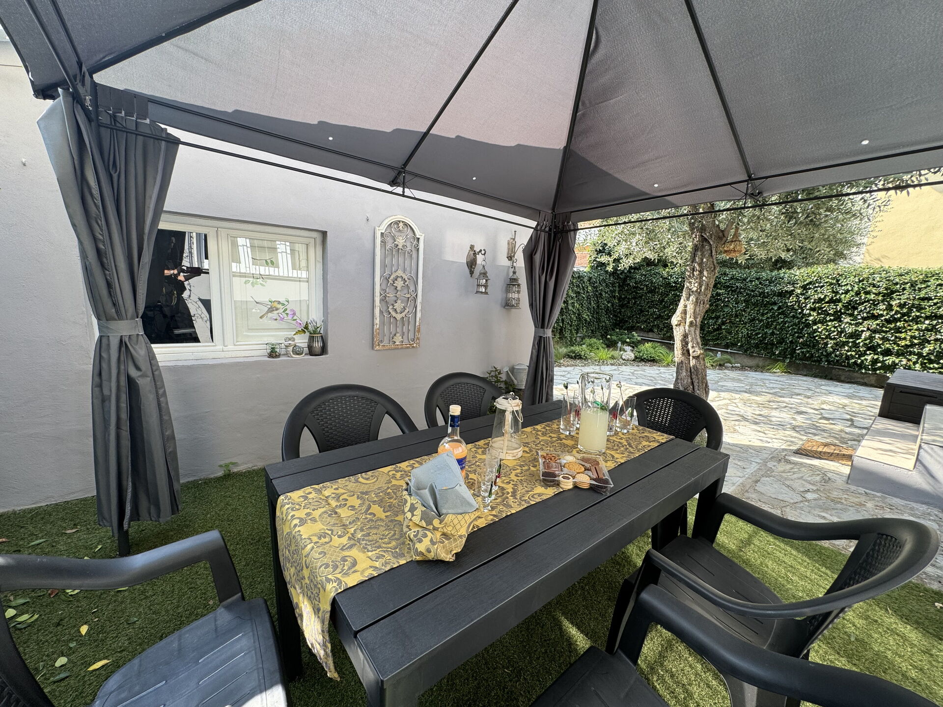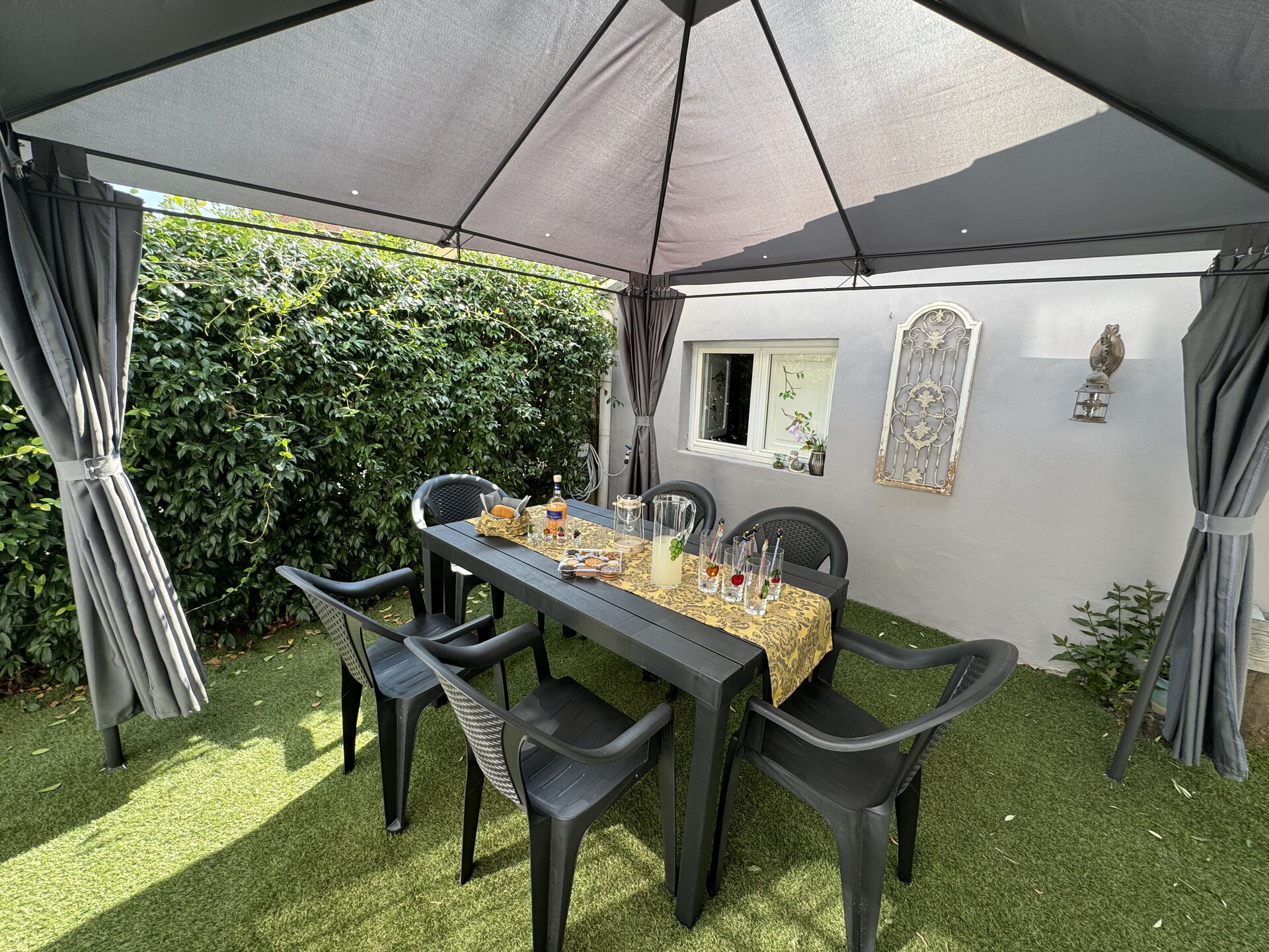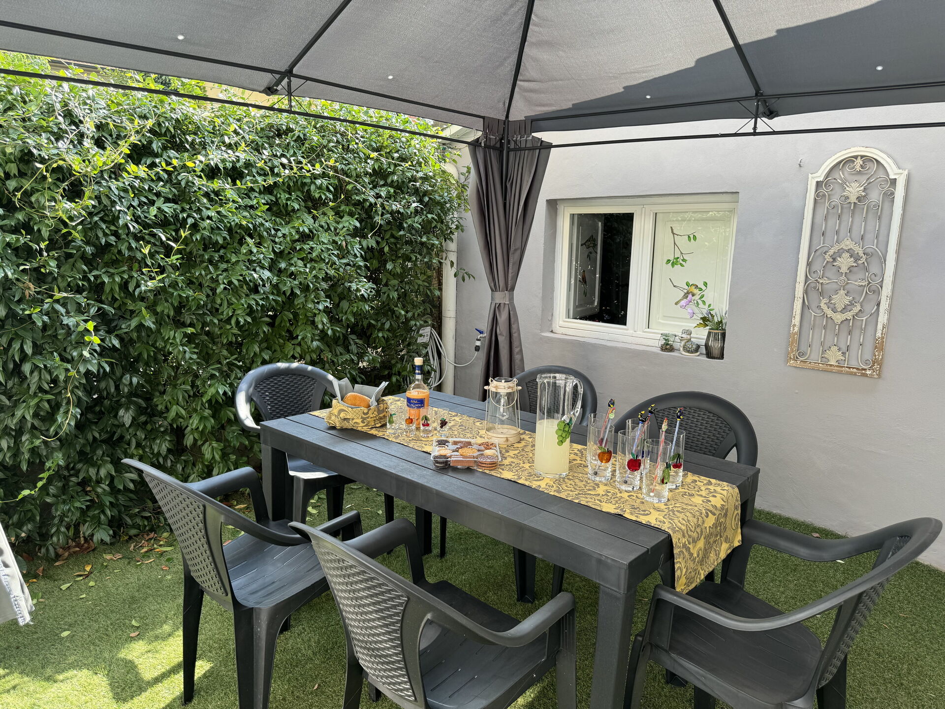 Garden: barbecue, al fresco dining, dining table (people: 6), gazebo, garden furniture, fenced.
