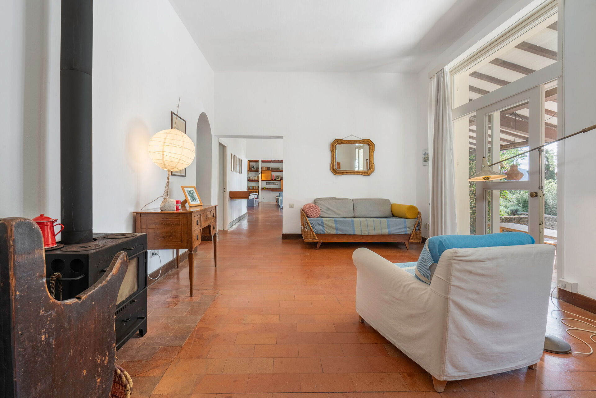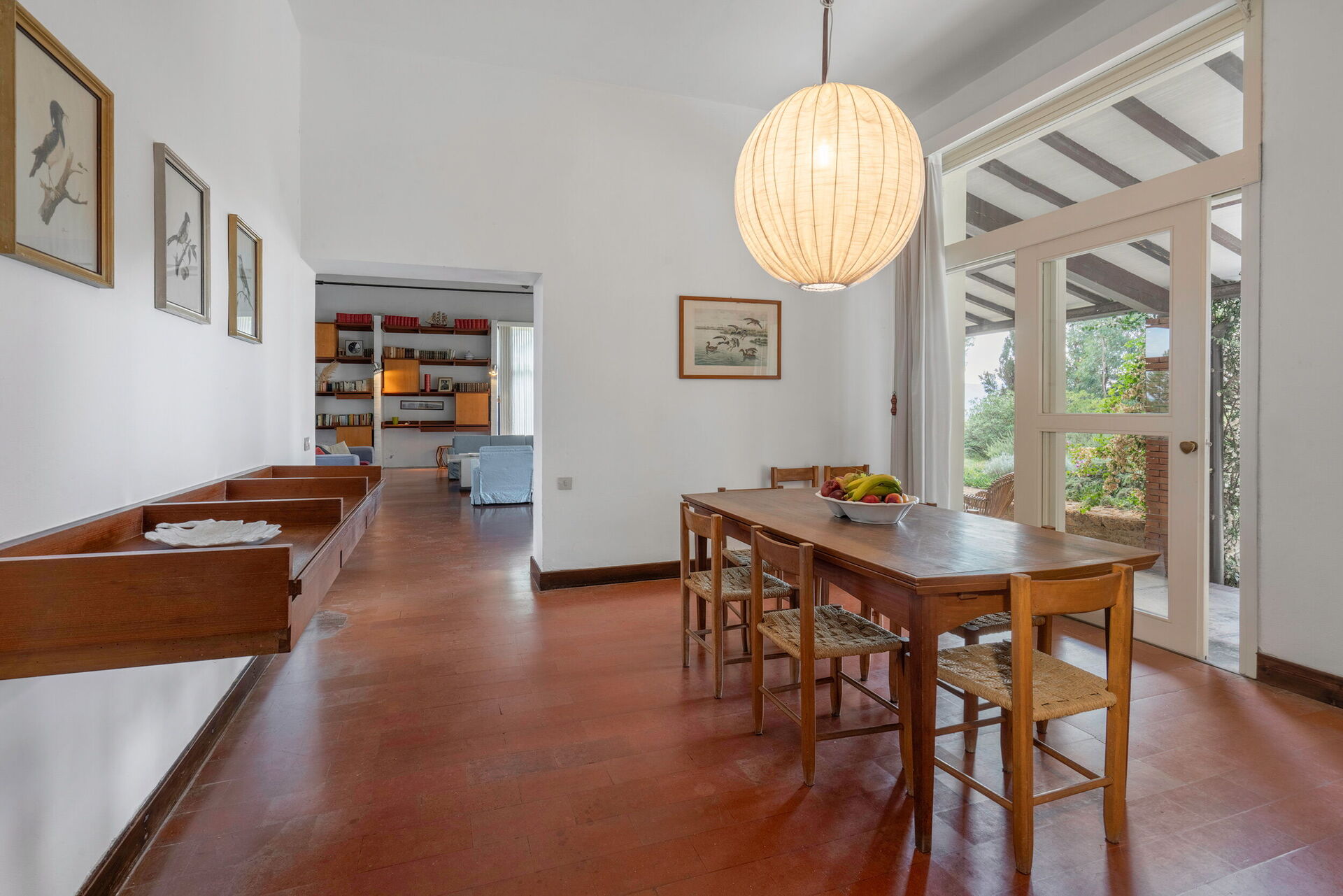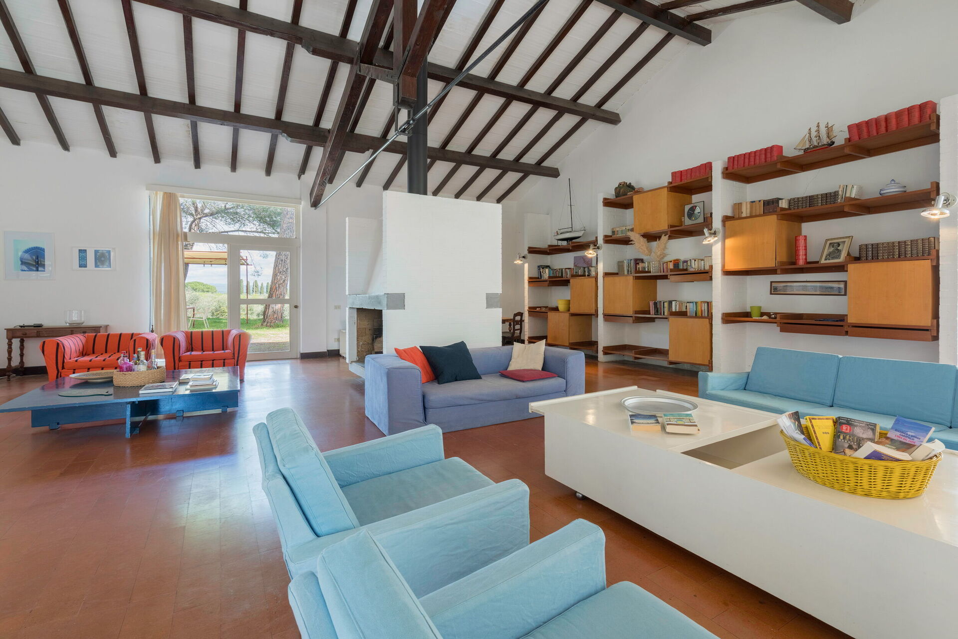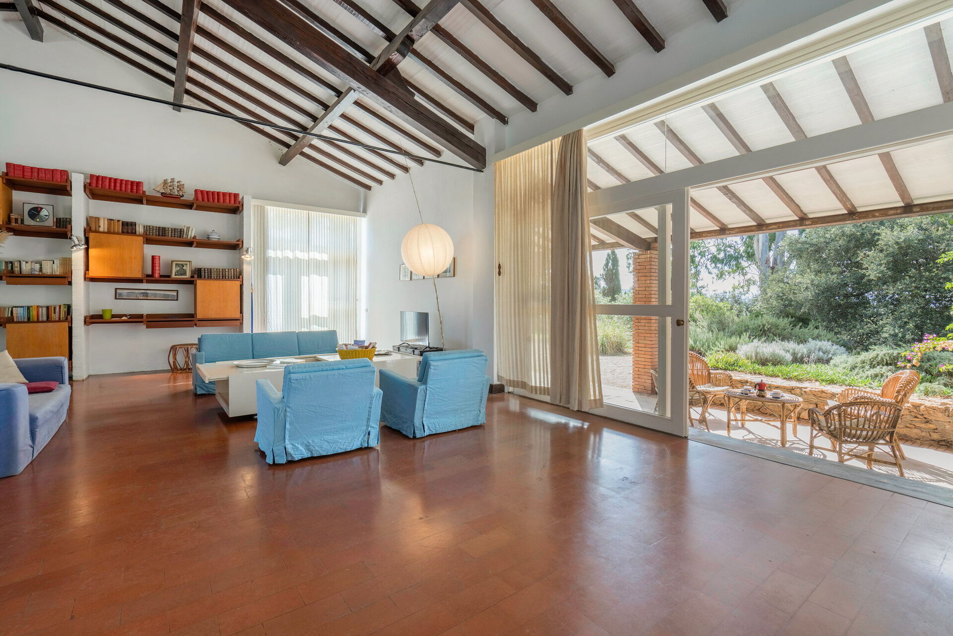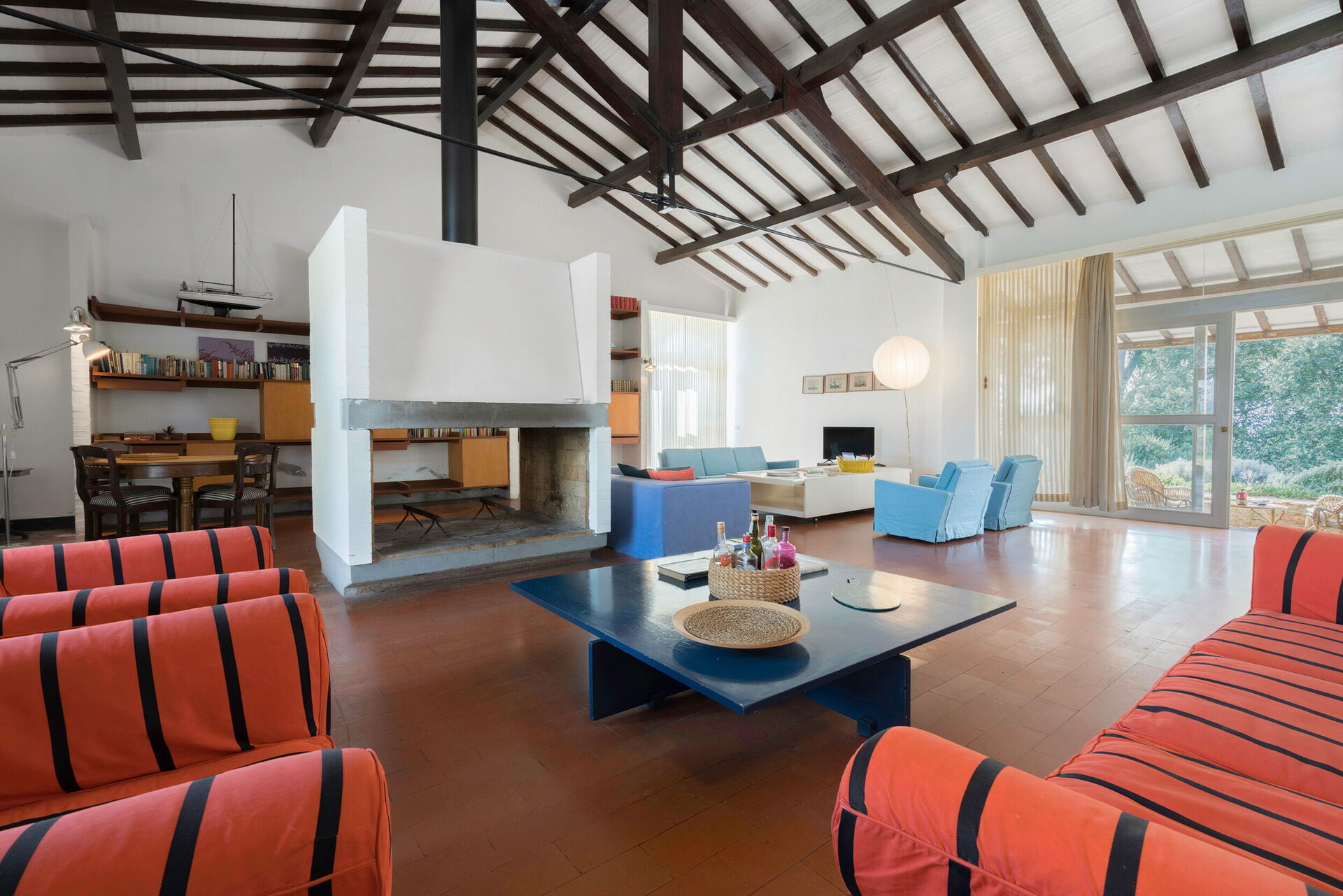 Living room 1: three sofas, four armchairs, television, exit to the garden.