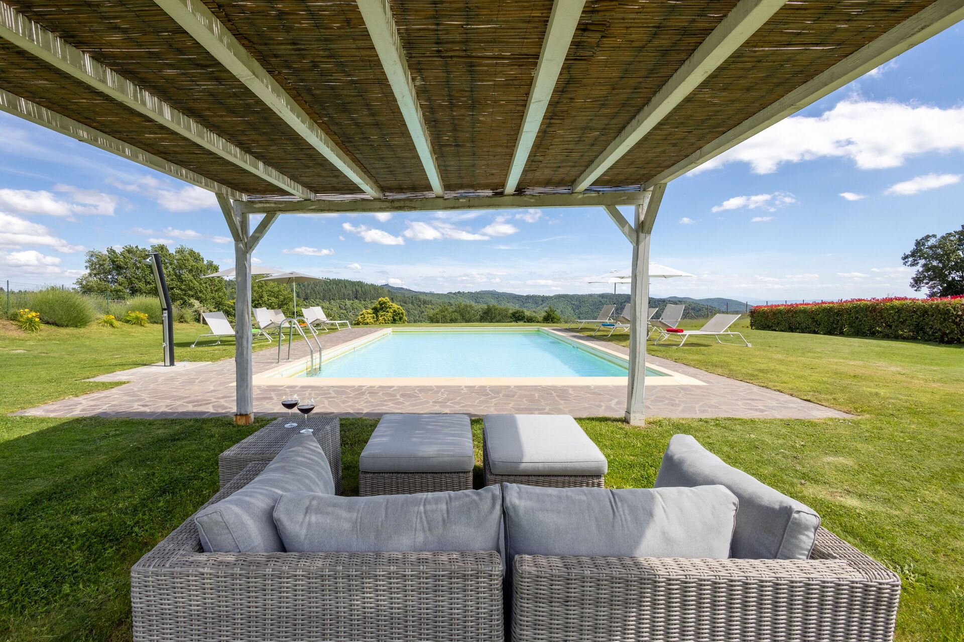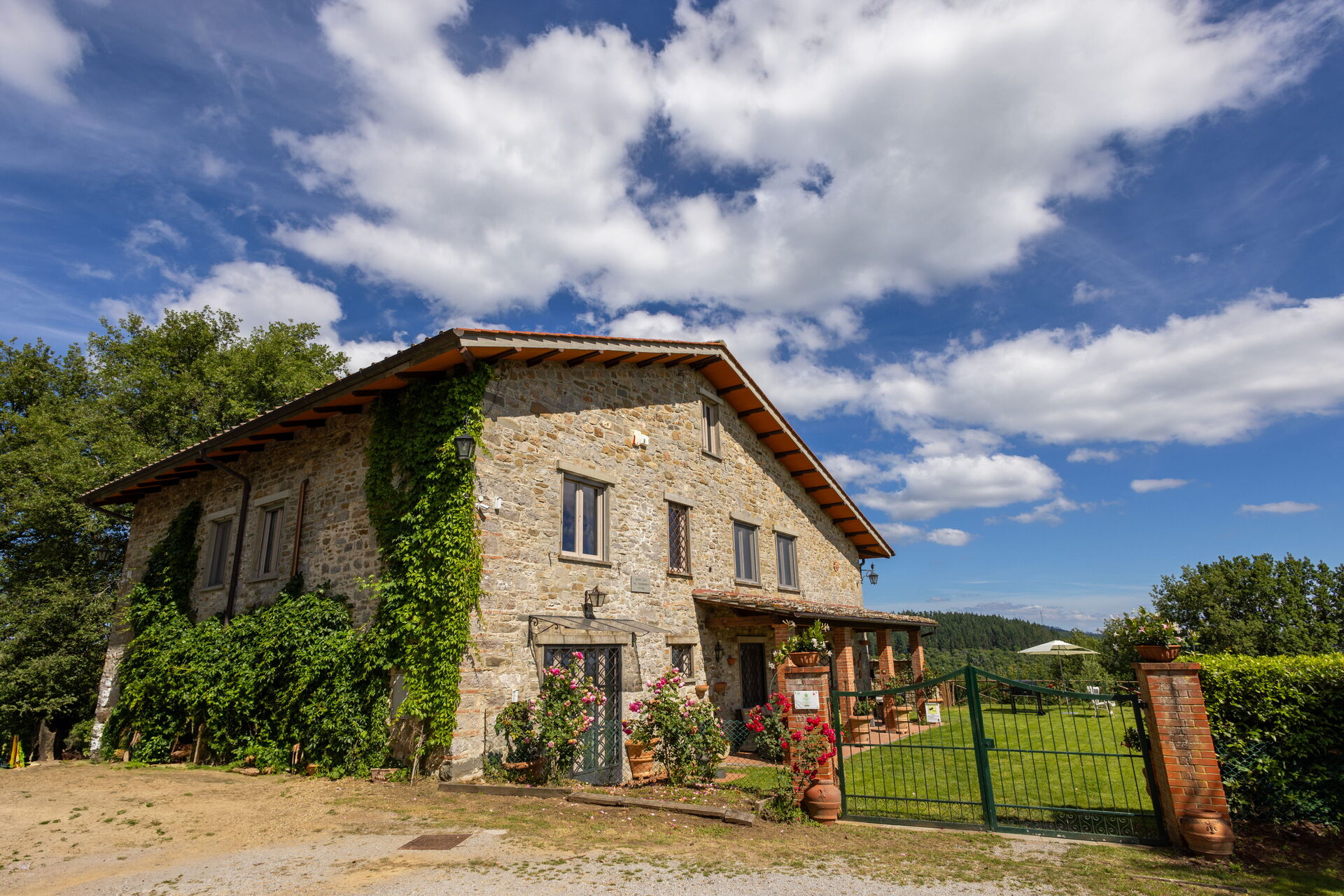 Upon arrival at Montelucci Chianti Agrivilla you’ll find a beautiful clean well-maintained property with views of the mountains and the hills perfect for a splendid vacation in Tuscany. Regardless of how you spend your days - visiting museums, shopping, sightseeing or just driving in the countryside, when you arrive home you can relax with your family and friends at the pool for a perfect ending to another day in Tuscany. Outdoors you will also find a patio and barbecue grill. Dining with friends and family is a huge part of the Tuscan culture. Take advantage of the well-equipped kitchen to prepare meals using local produce while on your vacation. The kitchen includes coffee machine, microwave, toaster, stove and refrigerator, as well as, plenty of tableware and cutlery for up to 14 people. Dine 'al fresco' like a real Tuscan, the fully furnished veranda is the perfect setting to enjoy food, family and the nice Tuscan weather.