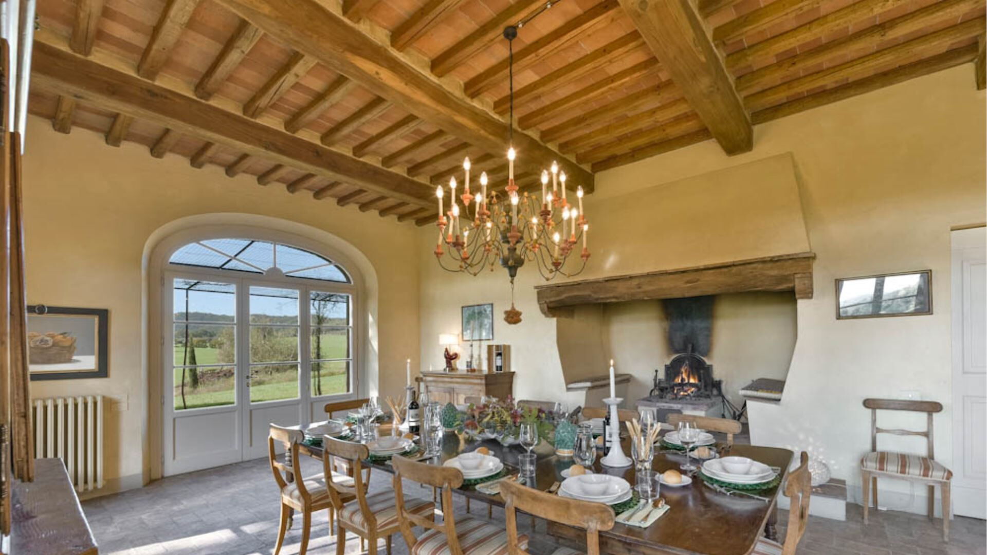 The property provides comprehensive climate control with air conditioning throughout the accommodations, ensuring your comfort during warmer months. Entertainment options include satellite TV and television, along with a DVD player for your leisure time. The kitchen comes fully equipped with modern appliances including a dishwasher for your convenience. A washing machine is available in the dedicated laundry room for handling your clothing needs. Both the living room and dining room feature charming fireplaces that create a warm and inviting atmosphere during cooler evenings. For outdoor entertaining, you have access to a barbecue facility perfect for preparing meals in the open air. The property also includes practical office equipment with a computer and fax machine, and a Turkish bath is available in the poolside shower facility for ultimate relaxation.