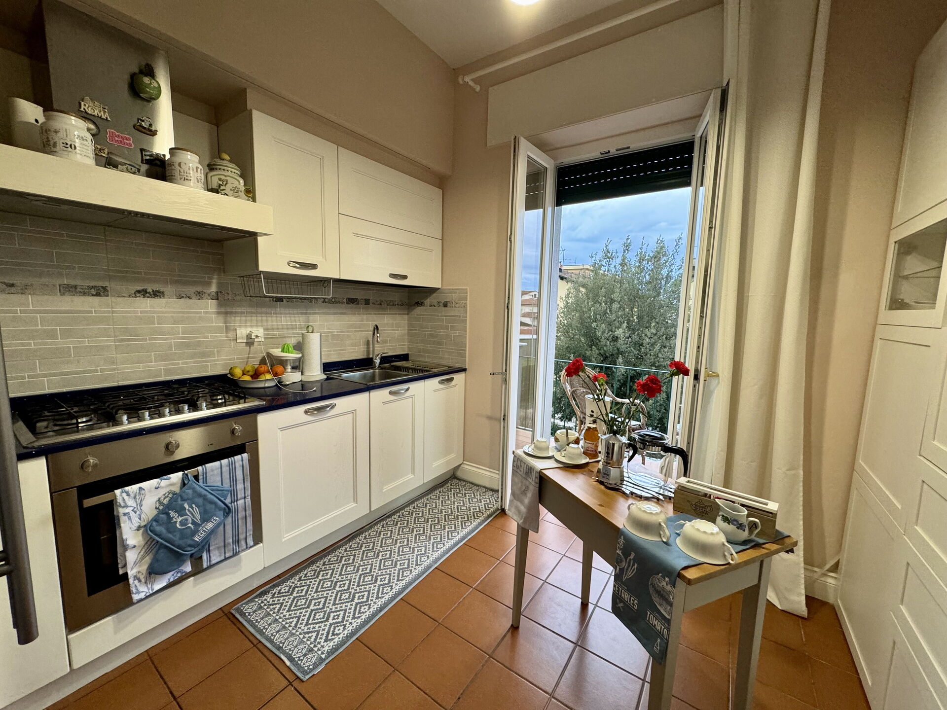 Kitchen: well equipped kitchen, dishwasher, fridge, freezer, microwave, oven, toaster, italian coffee machine, american coffee machine, exit to the balcony.