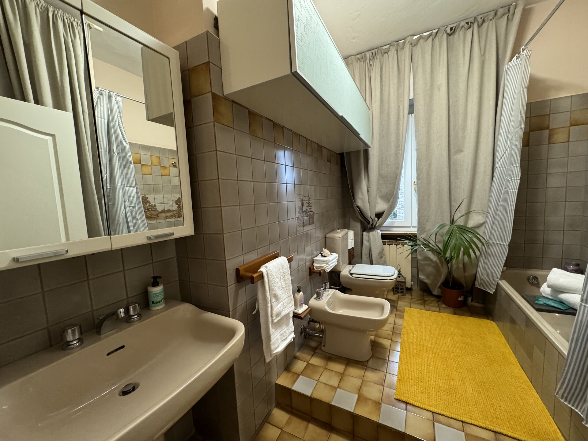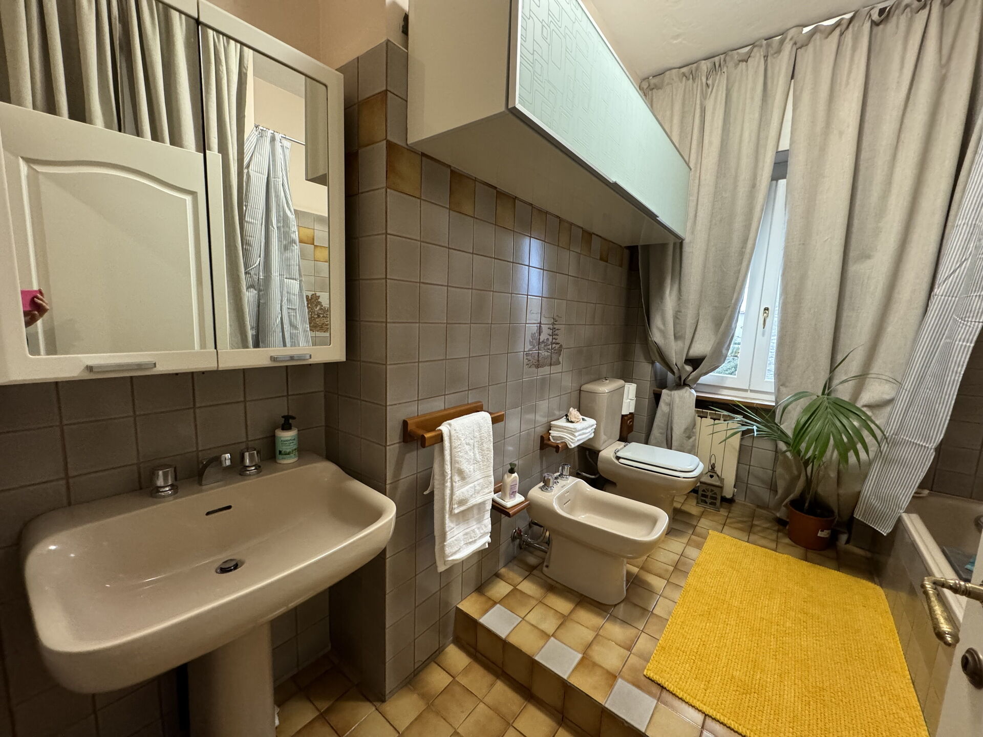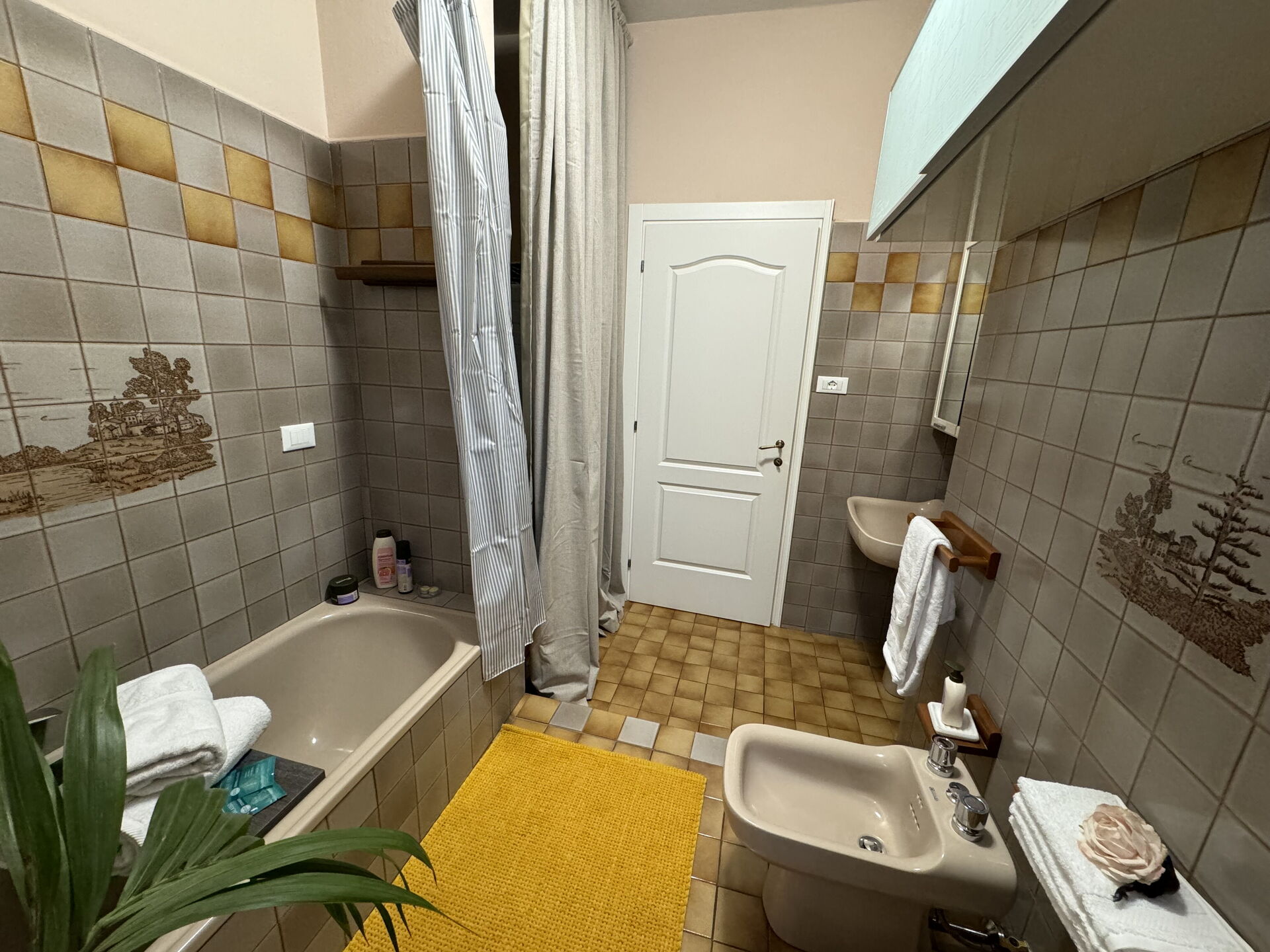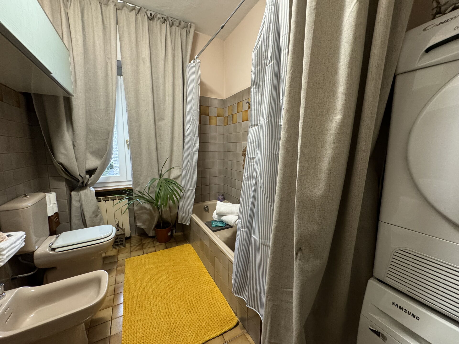 Bathroom: basin, toilet, bidet, bathtub, hairdryer, washing machine.