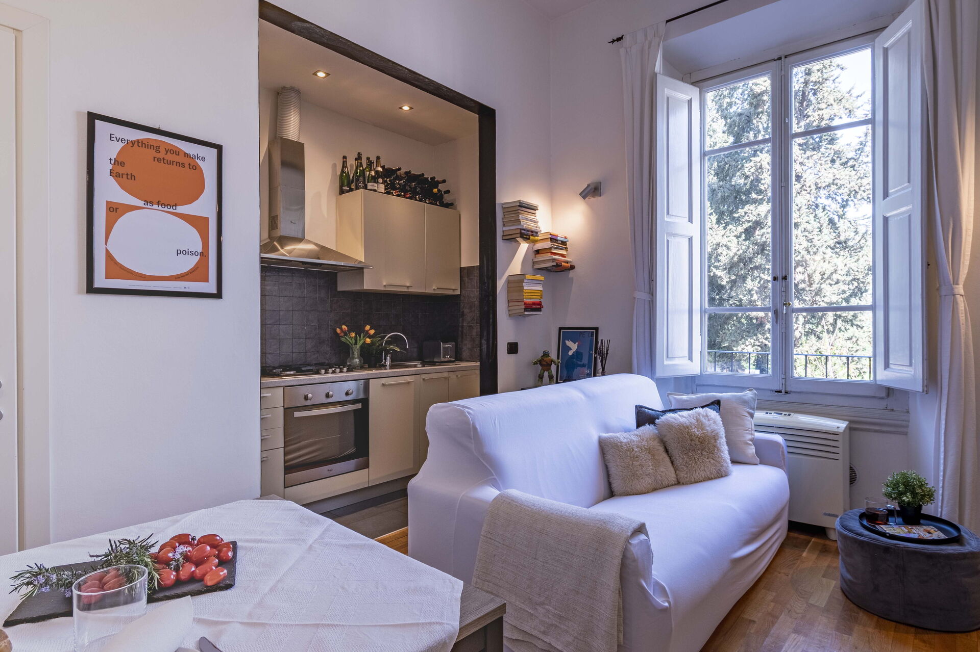 Upon arrival you will be greeted by the owner or manager where you’ll find a lovely clean well-maintained property with views of the city and the hills ideal for a relaxing holiday in Tuscany. Regardless of how you spend your days - sightseeing, visiting museums, shopping or just driving in the countryside, when you arrive home you can relax with your family and friends for a perfect ending to another day in Tuscany. If you enjoy cooking for family and friends there is a well-equipped kitchen including coffee machine, toaster, stove and refrigerator, as well as, plenty of tableware and cutlery for up to four people.