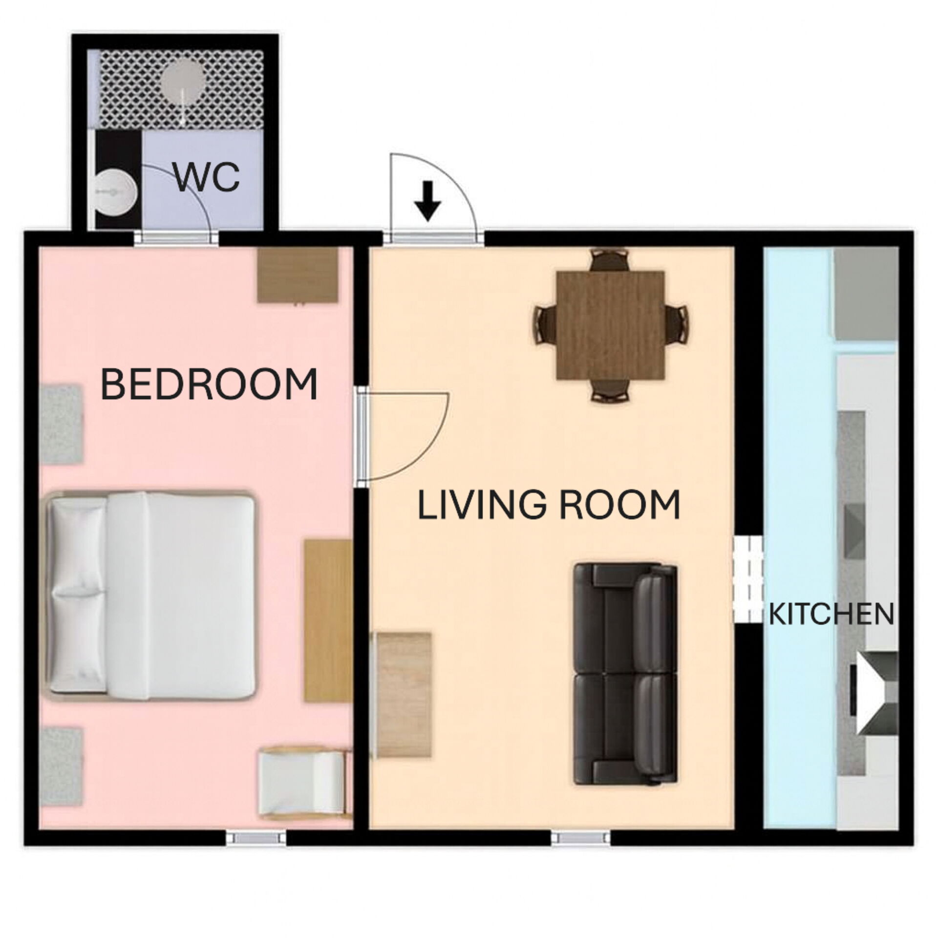 Including: kitchen, living room, bedroom, bathroom.