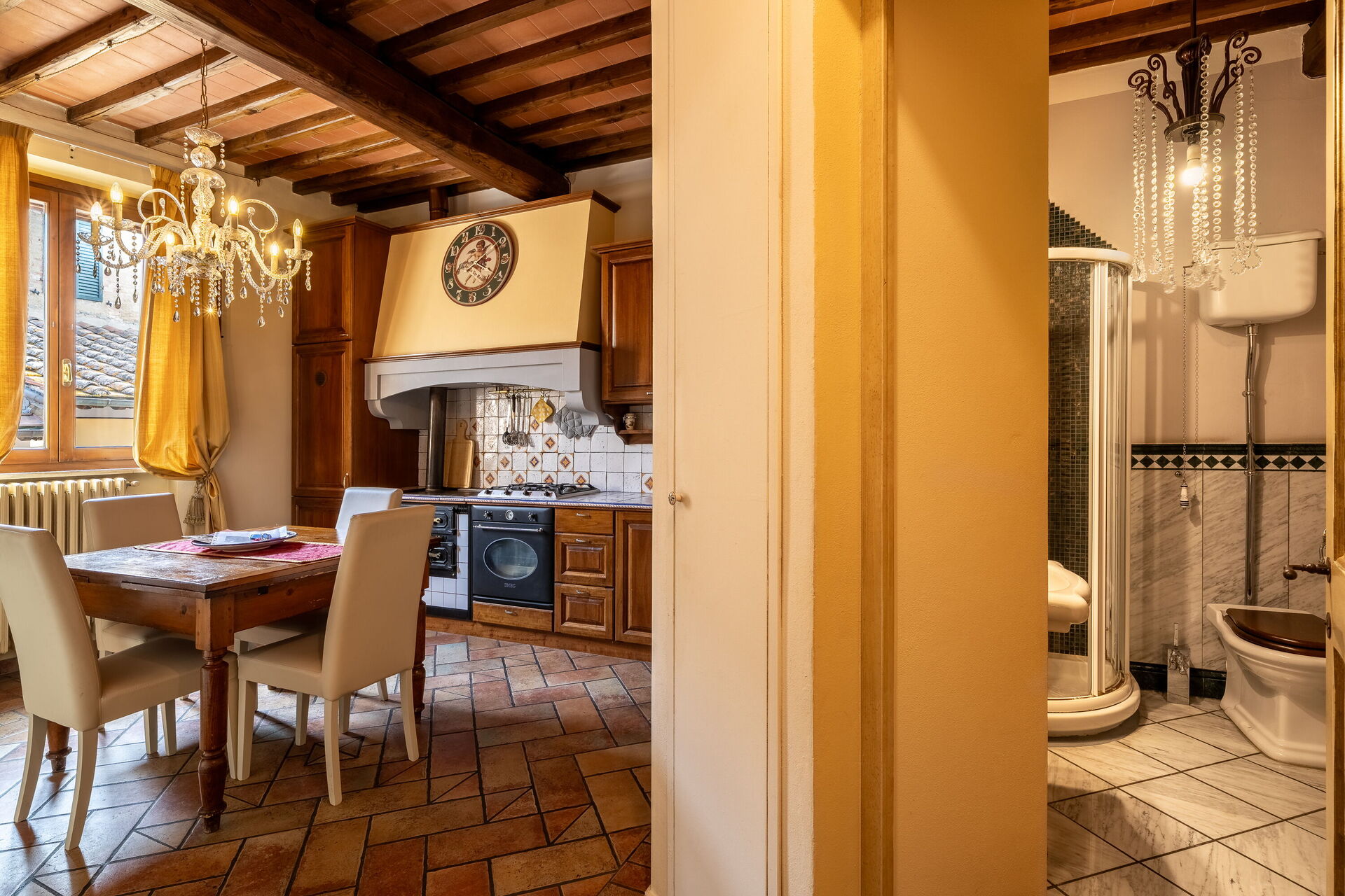 Upon arrival you’ll find a nice clean well-maintained property with views of the city perfect for a splendid vacation in Tuscany. Regardless of how you spend your days - sightseeing, shopping, visiting museums or just driving in the countryside, when you arrive home you can relax with your family and friends for a perfect ending to another day in Tuscany. Sharing a meal with friends and family is a big part of the Tuscan culture. Take advantage of the well-equipped kitchen to prepare meals using local produce while on your holiday. The kitchen includes coffee machine, microwave, stove and refrigerator, as well as, plenty of tableware and cutlery for up to five people.