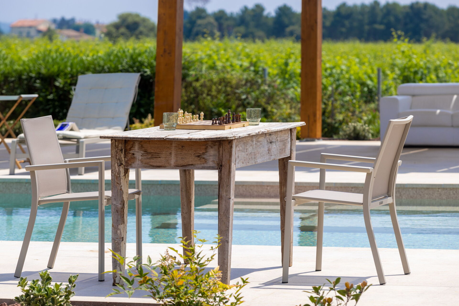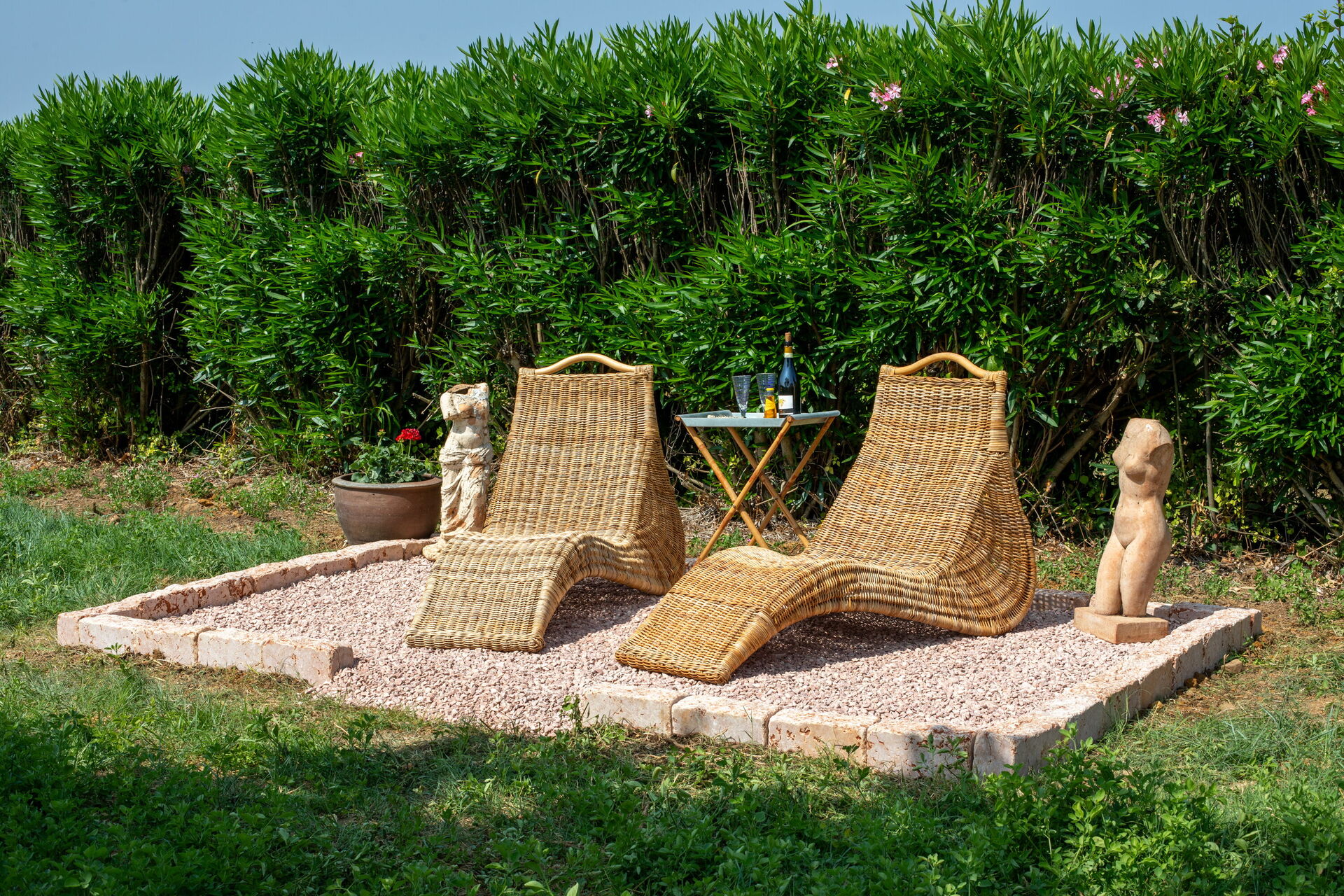 Garden (2000 m2): swimming pool, outdoor hot tub, shower, WIFI internet, barbecue, fireplace, dining table, garden furniture, terrace furniture, ten sunbeds, fenced, enclosed property, tennis court.