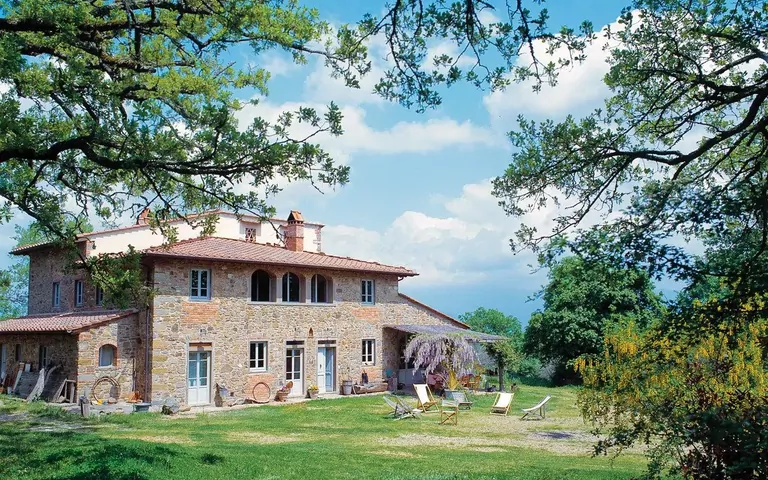 Surrounded by centuries-old oaks, olive groves and meadows, the ancient stone farmhouse lies nestled in the Chianti hills within a 30-kms radius of Florence, Siena and Arezzo in a vast natural garden.