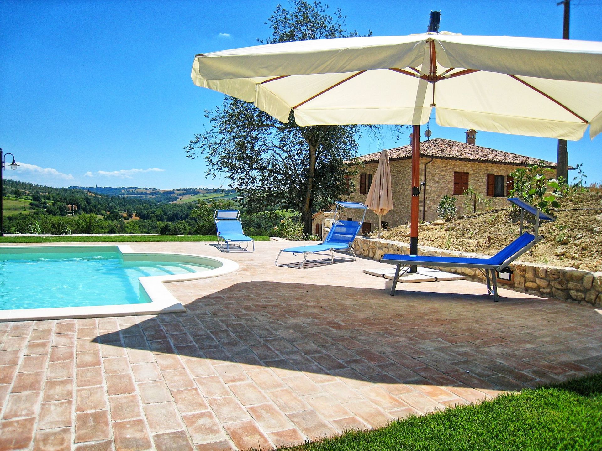 Comfortable and welcoming country house just a few kilometres from Todi, the famous city overlooking the Tevere valley, built by the Etruscans between 300 and 100 BC. The house sits in a tranquil spot among Umbria's green hills, and offers beautiful views of the surrounding countryside. Originally a farmhouse, the villa has been renovated with care, keeping its ancient charm and using authentic materials, such as terracotta floors and exposed beams. It is furnished completely and with quality, in a rustic style.