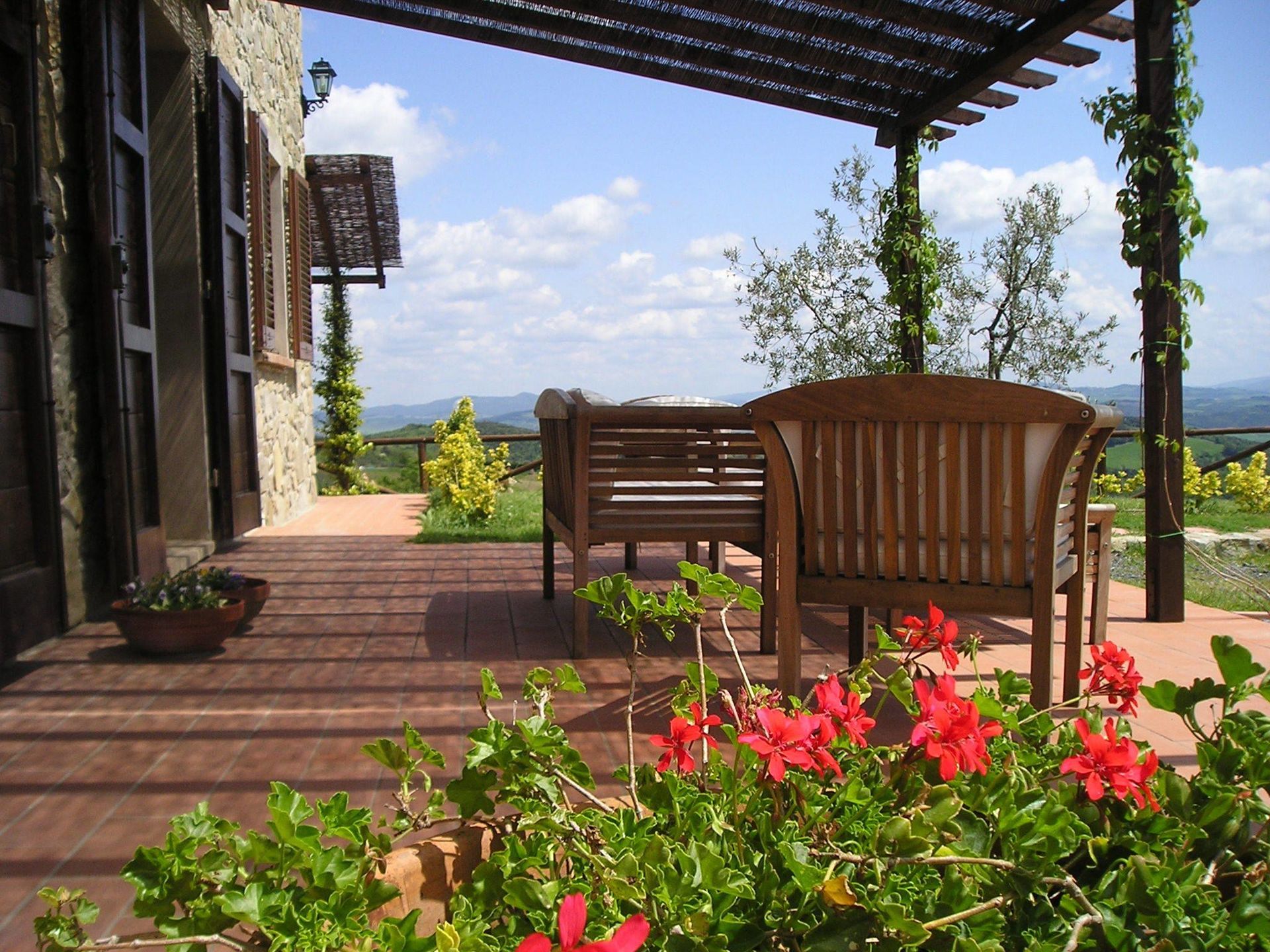 Private terrace with pergola enjoying a marvellous panorama and furnished with table and chairs.