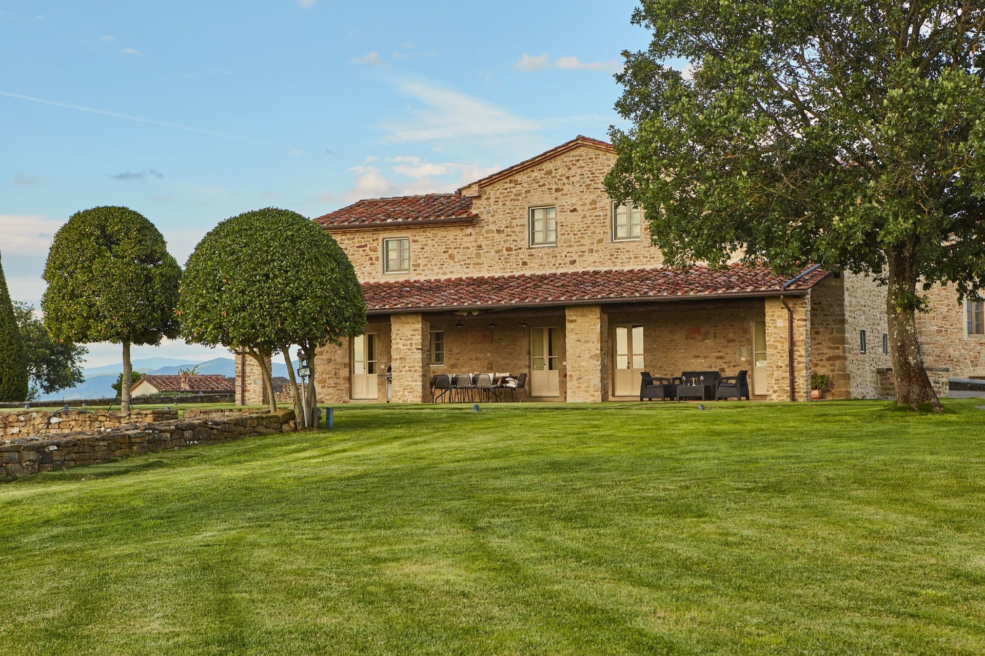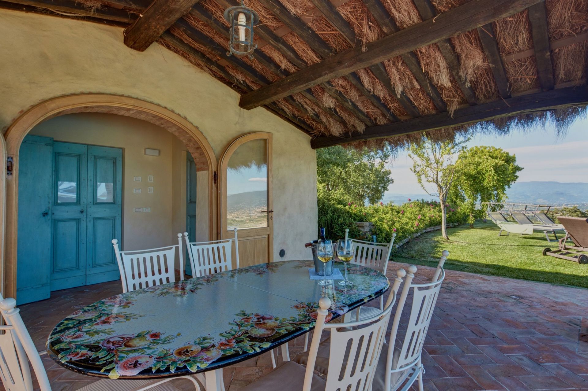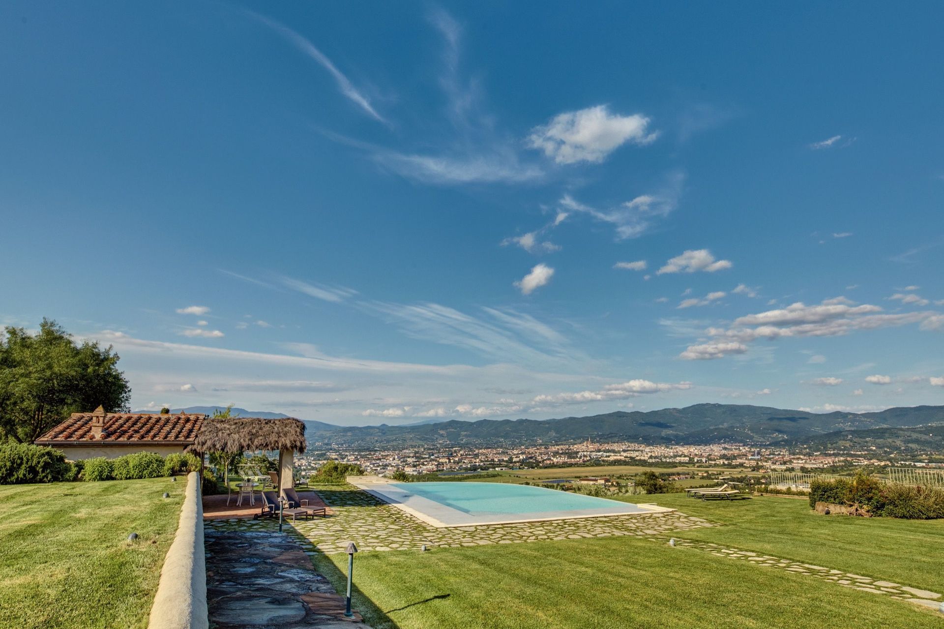 Beautiful, recently restored villa situated on a hill top overlooking the city of Arezzo and the Chiana valley. This property is entirely fenced in and comprises the owners’ house and a charming small church dating back to the 7th century. Outside guests can enjoy use of a large, well-groomed garden with a beautiful, private swimming-pool set in panoramic location. The villa was divided into 4 apartments which are connected internally and are rentable only together as a private accommodation. The interiors are welcoming and tastefully furnished. On the ground floor there is a large, furnished portico ideal for al-fresco dining.