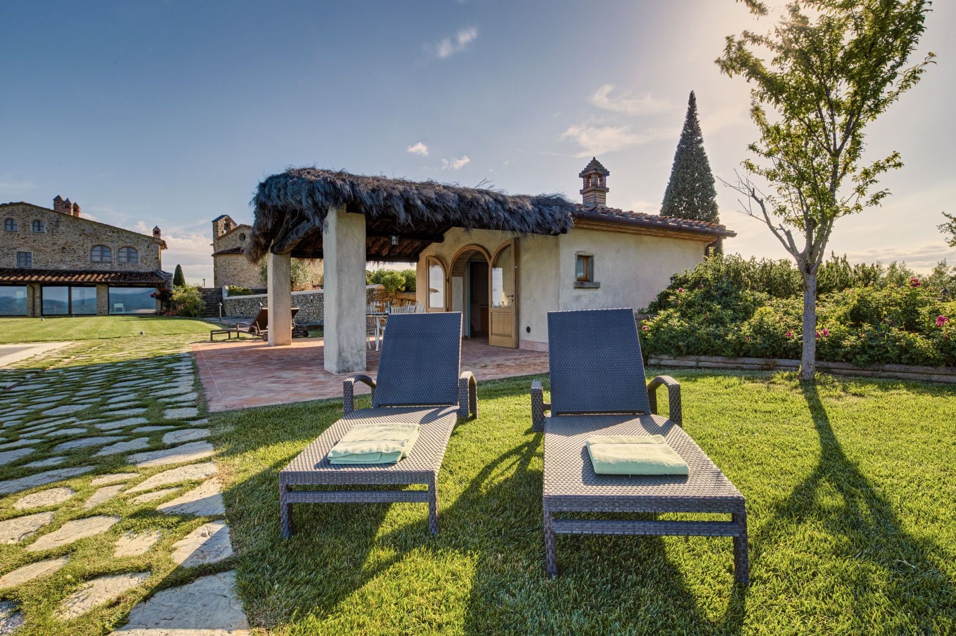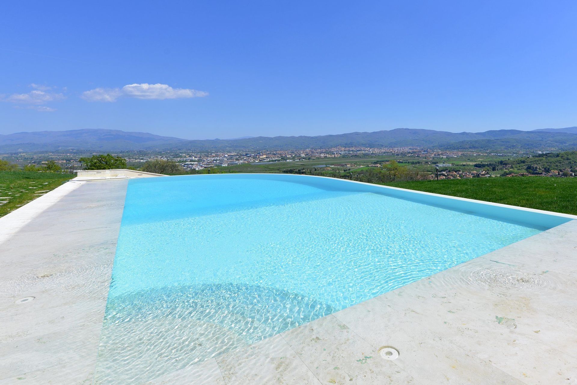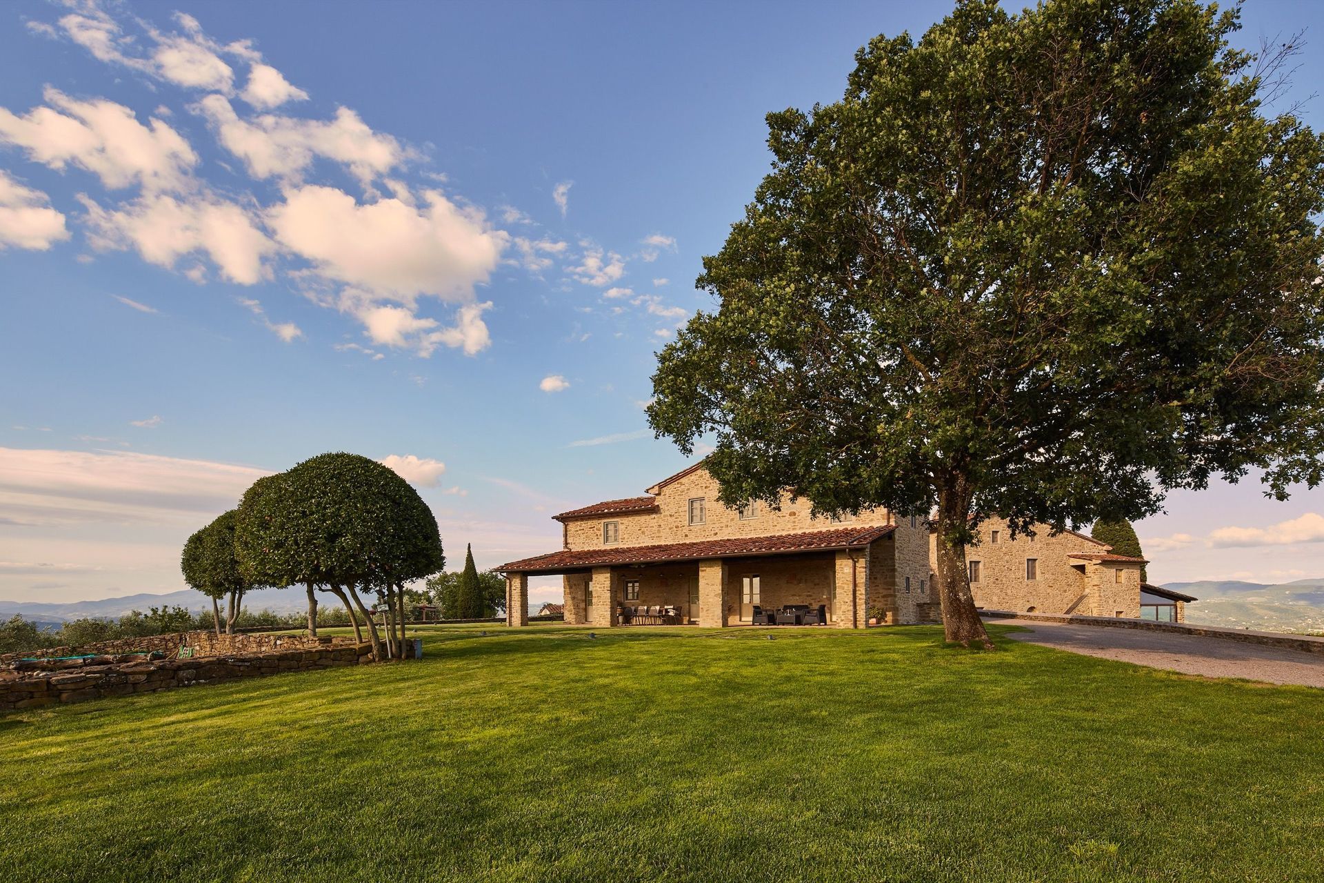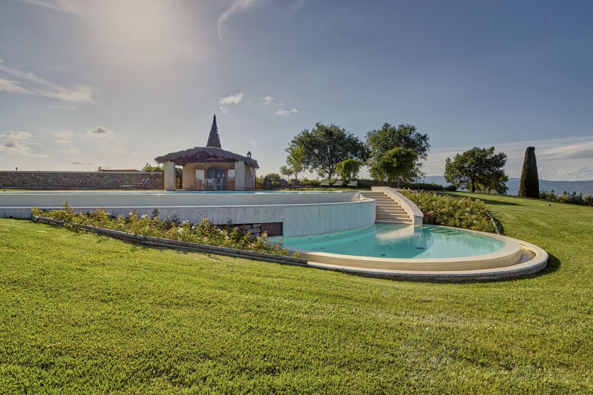 Beautiful, recently restored villa situated on a hill top overlooking the city of Arezzo and the Chiana valley. This property is entirely fenced in and comprises the owners’ house and a charming small church dating back to the 7th century. Outside guests can enjoy use of a large, well-groomed garden with a beautiful, private swimming-pool set in panoramic location. The villa was divided into 4 apartments which are connected internally and are rentable only together as a private accommodation. The interiors are welcoming and tastefully furnished. On the ground floor there is a large, furnished portico ideal for al-fresco dining.