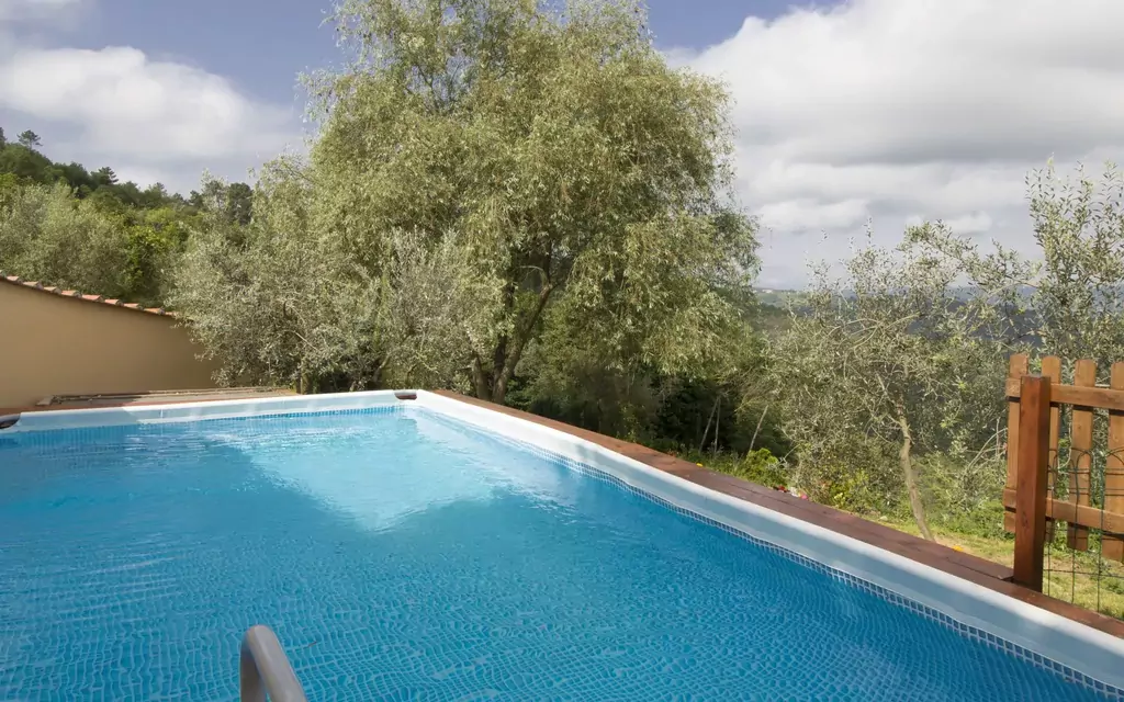The country house boasts a fenced, above-ground swimming pool, measuring 7 x 4 meters with a depth of 120 cm, available seasonally from May to September. The property is perched atop a hill, offering breathtaking views of the Val Di Chiana countryside and a serene outdoor environment.