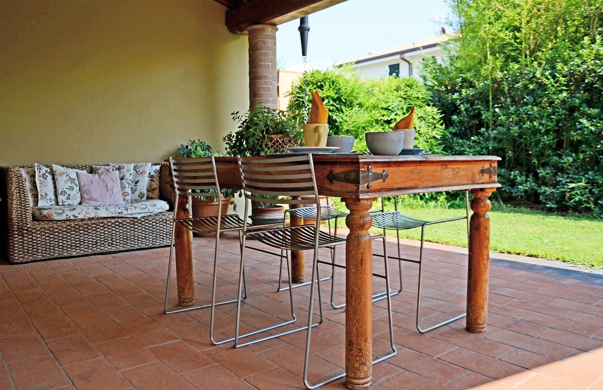 This apartment has a private, covered veranda equipped with a table and chairs. It has a small entrance which leads into a sitting room with a kitchenette, one double bedroom and a fully furnished bathroom including a hairdryer. The house has all the modern comforts including heating, air conditioning and a TV.